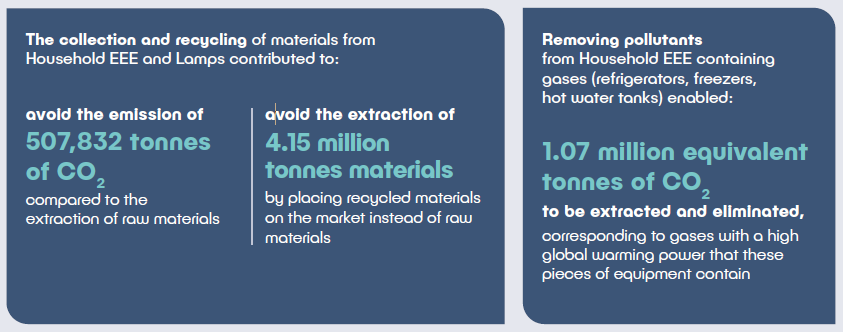 - Removing pollutants from Household EEE containing gases (refrigerators, freezers, hot water tanks) enabled: 1.07 million equivalent tonnes of CO2 to be extracted and eliminated, corresponding to gases with a high global warming power that these pieces of equipment contain.